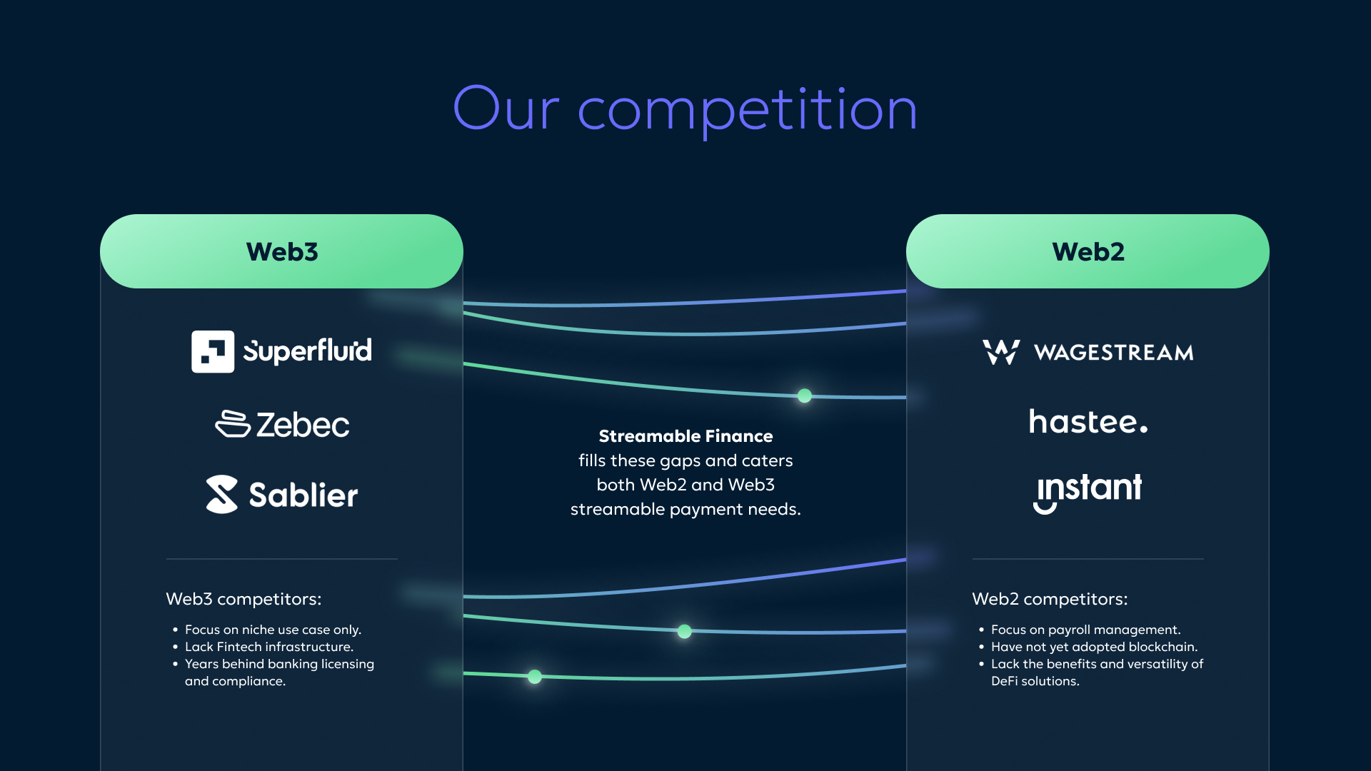 Our main asset-streaming competitors in Web3 are Superfluid, Sablier and Zebec. Web2 money streaming competition that resembles Streamable Finance mostly is Wagestream, Hastee and Instant.