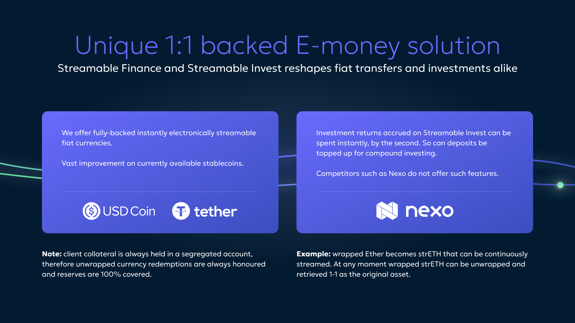 On the other hand, our Fiat-focused competitors lack the benefits and versatility of decentralised finance solutions provided by blockchain technology. Streamable Finance combines the best of both worlds and brings a streamable fiat and crypto payment infrastructure for businesses and individuals regardless of crypto proficiency or financial preferences. In the stablecoin arena, our electronically streamable, 1-1 backed fiat currency is a vast improvement on currently offered stablecoins in terms of safety and redeemability.